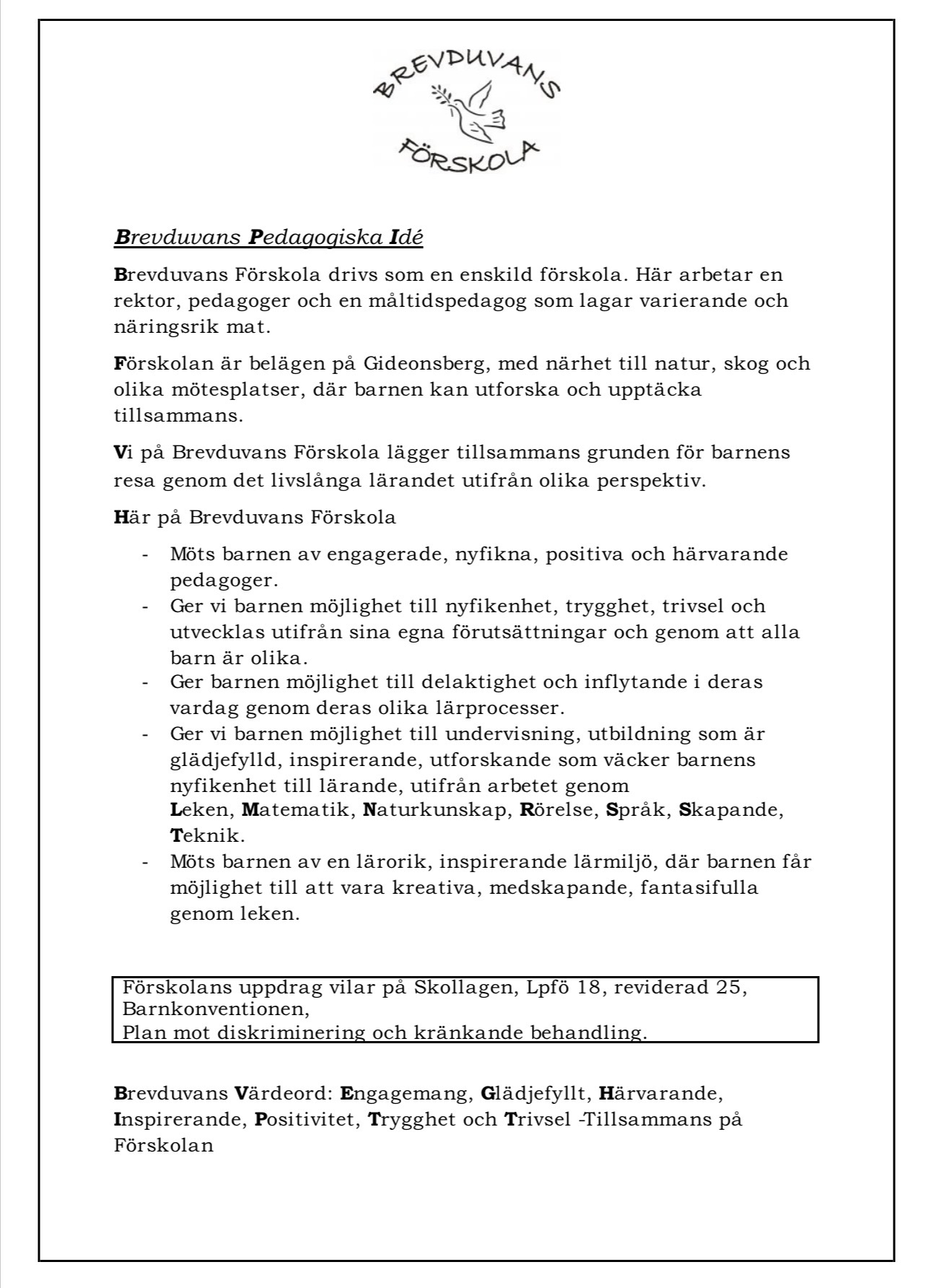 Brevduvans Förskola är en enskild förskola belägen i natursköna Gideonsberg, Västerås. Arbetslaget består av rektor, förskollärare, barnskötare och en måltidspedagog. Vår förskola är en trygg och inspirerande plats där barn får utvecklas genom lek, kreativitet och lärande. Vi arbetar utifrån läroplanen (Lpfö 18 rev 25), skollagen och barnkonventionen och sätter varje barns nyfikenhet, delaktighet och trygghet i centrum. Med engagerade pedagoger skapar vi en miljö som främjar gemenskap, respekt och glädje varje dag.
